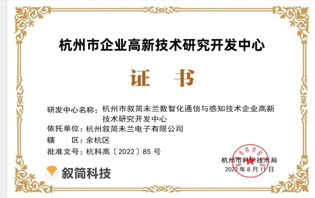杭州敘簡未蘭電子有限公司申報的“杭州市敘簡未蘭數(shù)智化通信與感知技術(shù)企業(yè)高新技術(shù)研究開發(fā)中心”經(jīng)過杭州市科技局組織的專家組現(xiàn)場實地考察和評審,順利通過各項審核標準,符合研發(fā)中心建設(shè)條件,成功獲得杭州市企業(yè)高新技術(shù)研究開發(fā)中心認定!