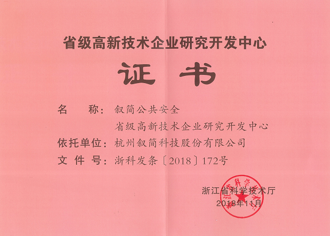 2018杭州敘簡科技股份有限公司“敘簡公共安全研發(fā)中心”被認定為省級高新技術(shù)企業(yè)研發(fā)中心,這標志著公司在公共安全領(lǐng)域的技術(shù)研發(fā)能力方面有了進一步的提升,達到了國內(nèi)同行業(yè)先進水平。