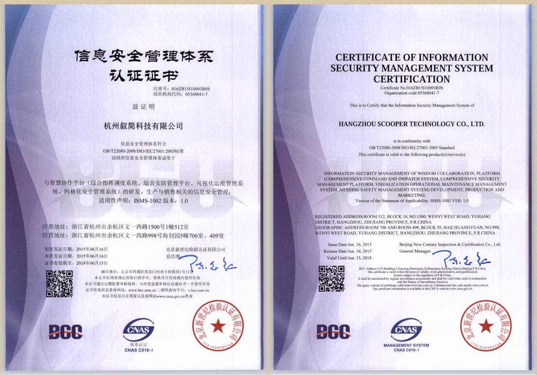 2015年06月16日,叙简科技通过了ISO27001信息安全管理体系认证,并由北京新世纪检验认证有限公司(简称BCC,是具有独立公正地位的第三方认证机构)颁发,具有中国CNAS(中国合格评定国家认可委员会)标识的证书,正式成为ISO27001信息安全管理体系认证的企业,在“质量管理体系认证(ISO9000)”的基础上又增加了对信息安全的控制。