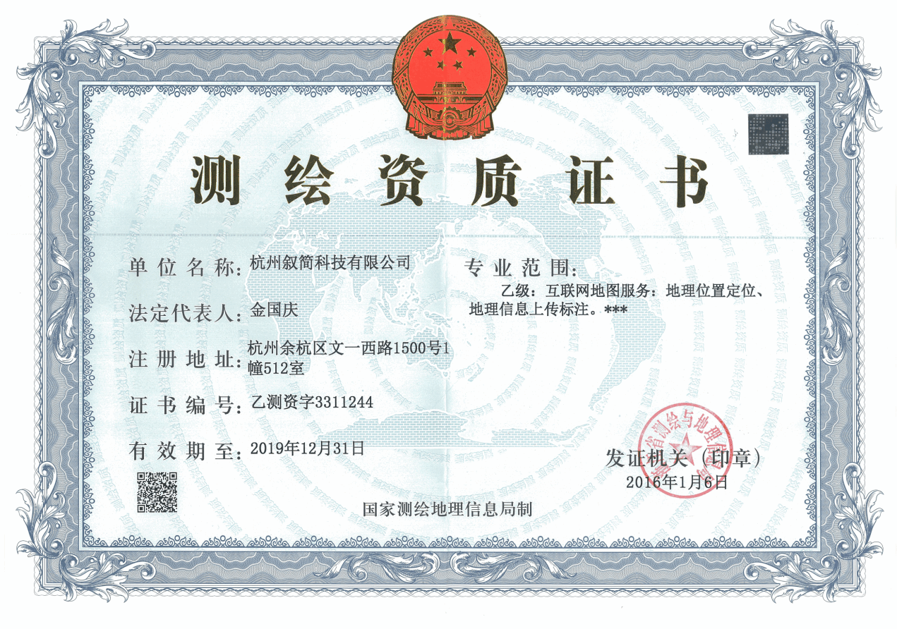 2016年1月6号,浙江省测绘与地理信息局给叙简科技颁发了乙级互联网地图服务测绘资质证书。