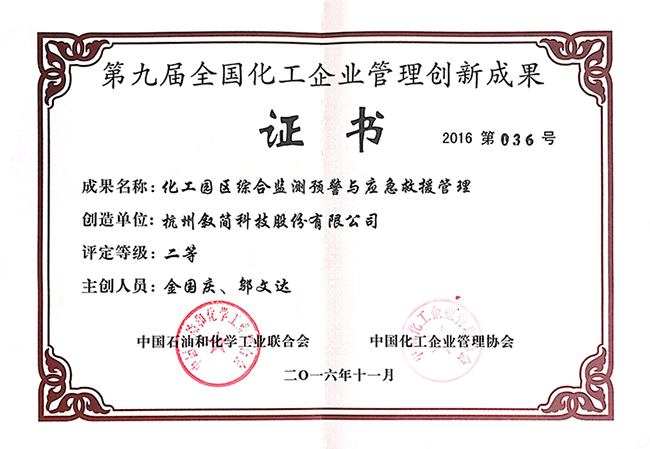 11月15日,第九届全国化工企业管理创新大会在北京人民大会堂举行,50项全国化工行业管理创新成果发布。叙简科技化工园区综合监测预警与应急救援管理平台被评定为二等化工企业管理创新成果。