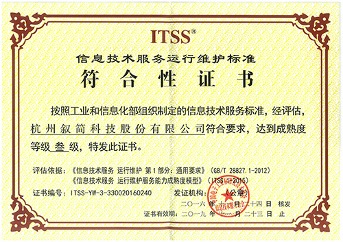 近日,叙简科技通过工业和信息化部组织制定的信息技术服务标准,获得了信息技术服务运行维护(ITSS)三级证书。