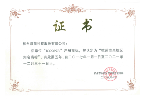 近日,根据《杭州市余杭区知名商标认定和管理办法》及《杭州市余杭区知名商标认定工作程序》的规定,在企业申报、各镇街、平台推荐、抽查考核的基础上,经杭州市余杭区知名商标认定委员会评审,叙简科技“ICOOPER”商标被认定为余杭区知名商标。