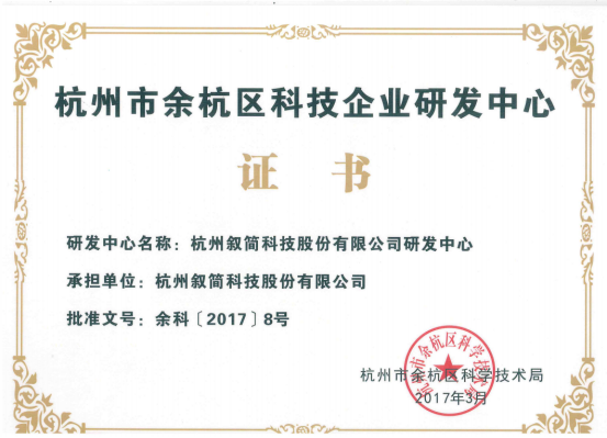 叙简科技十分注重研发队伍的建设和科技创新的投入,近期,公司通过余杭区科技局的评定,正式取得余杭区科技企业研发中心证书。