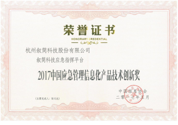 “叙简科技应急指挥平台”是叙简科技自主研发的,以应急处置与救援为核心,监测预测预警为重要组成部分的综合性应急平台。该平台得到专家委员会的高度认可并被中国信息协会授予“2017年中国应急管理信息化产品技术创新奖”荣誉称号。