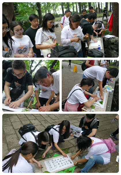 抵达集合点后,各队更是大显神通,纷纷用路边的树叶装点起美丽的画卷,打油诗、抒情诗、藏头诗齐齐上阵: