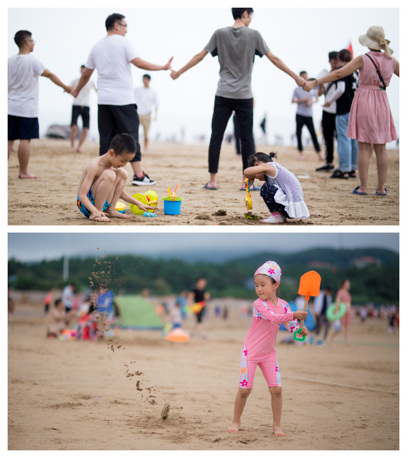小朋友们也带上他们的铲子、桶、车等诸多玩具开始他们的沙滩建筑大战了!