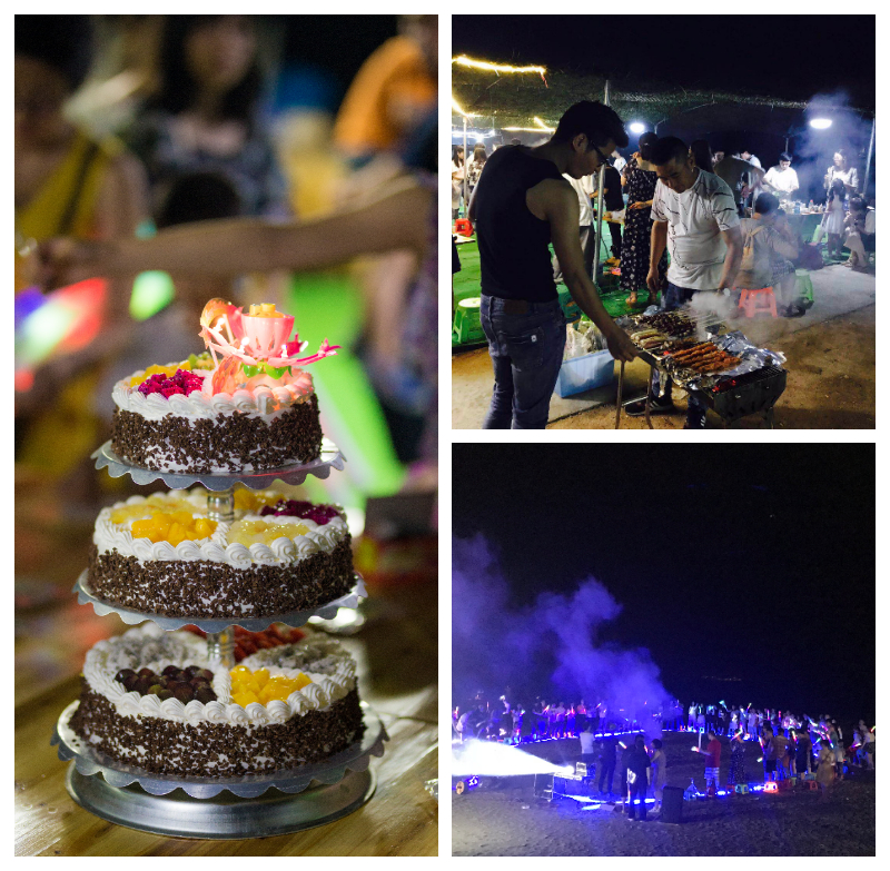 晚上,进行了沙滩烧烤和篝火晚会。吃着美食喝着美酒,载歌载舞;