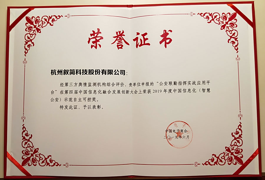 杭州叙简科技股份有限公司“公安联勤指挥实战应用平台”经第三方舆情监测机构综合评价,荣获2019年度中国信息化(智慧公安)示范自主可控奖。