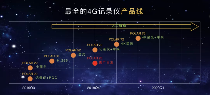 本次发布的POLAR系列产品包括覆盖记录仪+POC对讲功能的20、22系列,后续规划的产品有高清双摄的POLAR50系列、高清星光的POLAR52系列、大屏三摄的POLAR70系列、4K星光大内存的POLAR72系列以及顶配的POLAR76系列。