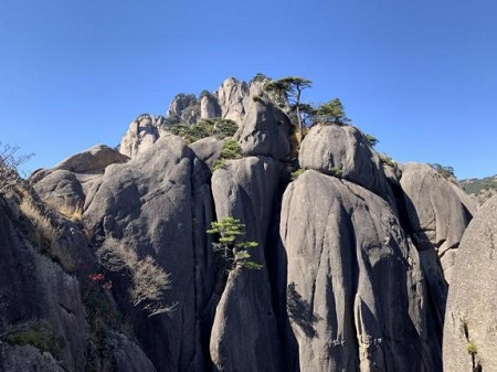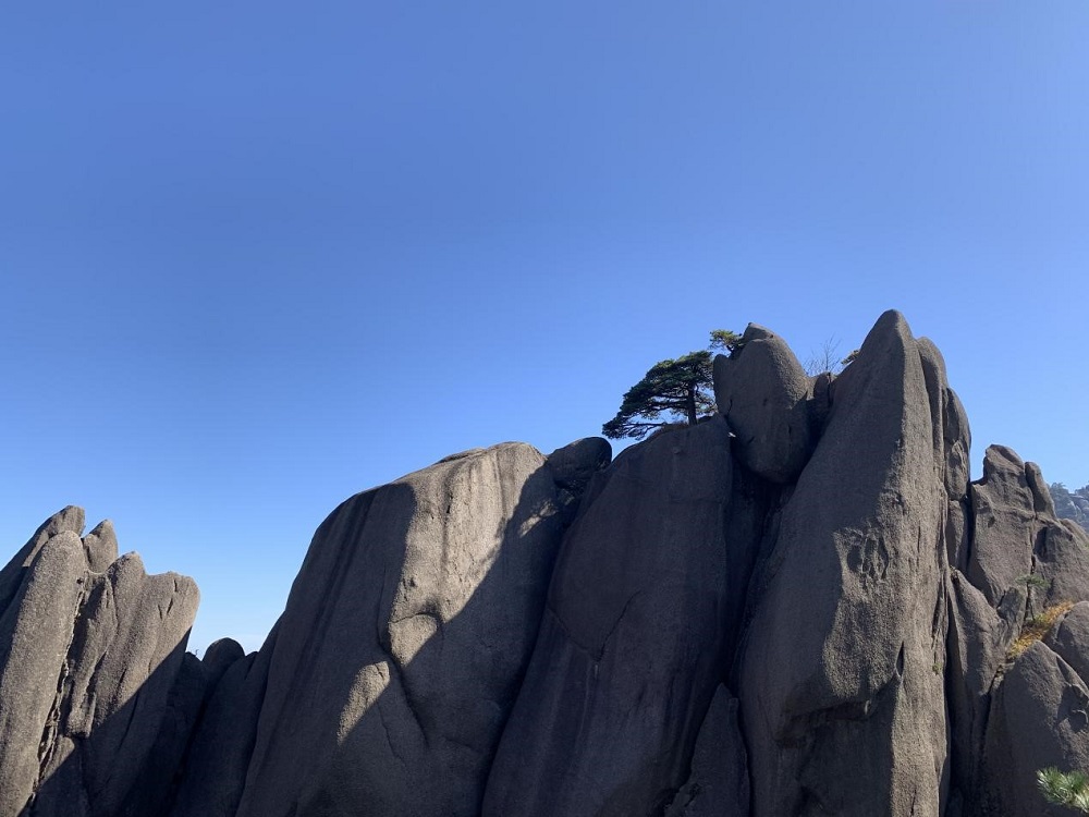 迎客松至今为止已有800多年的历史,为黄山的“四绝”之一。他的生长方式奇特,扎根在岩石缝,枝丫都向一侧伸展,如人伸出一只臂膀欢迎远道而来的客人。迎客松设有专门的护松人,他们以保护迎客松为己任。黄山上的奇石也是黄山“四绝”之一,形态各异,令人浮想联翩。