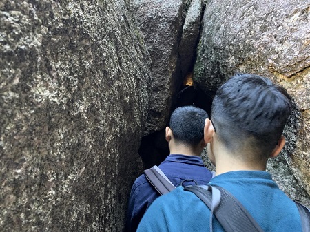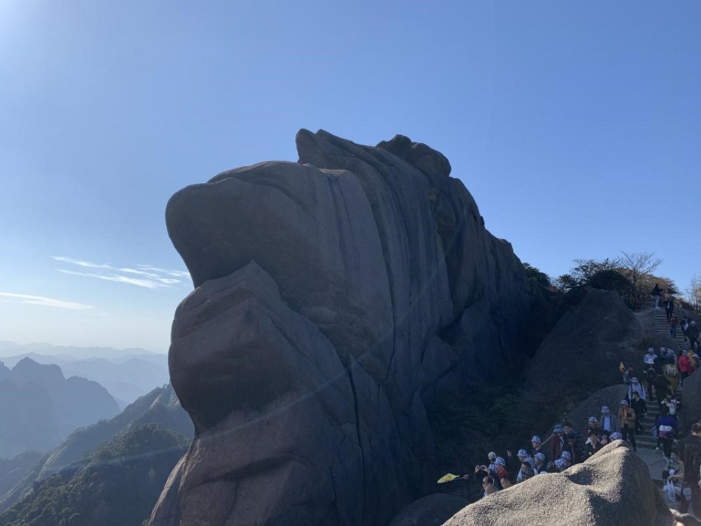 莲花峰上的石头连在一起就像一朵盛开的莲花,是黄山景区内的第一座高峰。莲花峰主峰突兀,小峰簇拥,好似新莲初开,仰天怒放,故名“莲花峰”。登峰起步缓坡称“莲梗”,中间穿过四个石洞称“莲孔”。小伙伴们在石洞里拾级而上,恰似“倾曲作蚁旋出花萼中”。