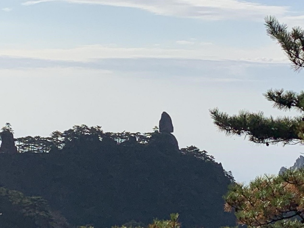 云海之中,我们看到了小学课本中的飞来石,仿佛是从天上飞来的恰好停在这片山顶上。看到奇石“鳌鱼”,顾名思义,看起来就像是一条巨大的鳌鱼。还有许多叫不出名字的石头,小伙伴们还一起为这些奇石取名,气氛热烈。