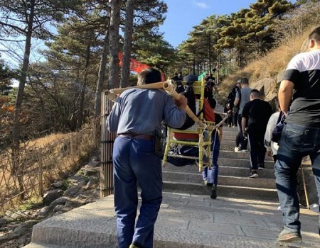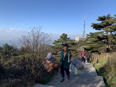 在旅途中,我们还看到了黄山挑山工,黄山上的所有食材都是由挑山工一担一担挑上去的。