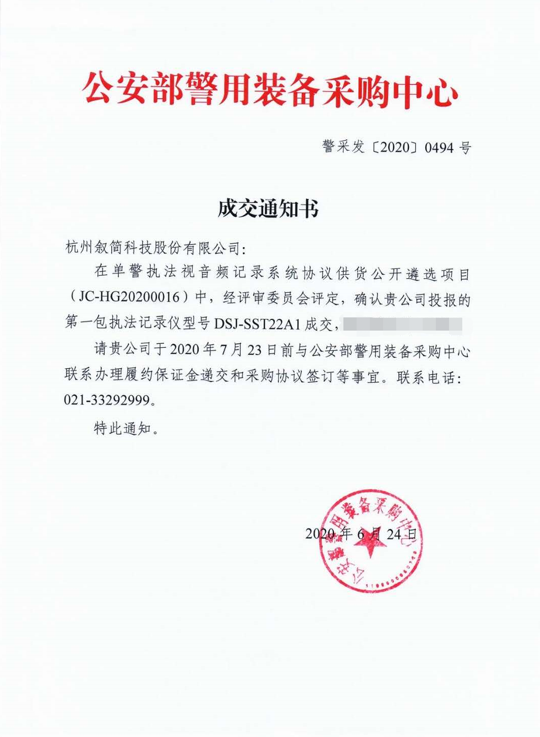 2020年6月24日,公安部警用装备采购中心发布“单警执法视音频记录系统协议供货公开遴选项目”评标结果,叙简科技成功入围执法记录仪设备供应商。