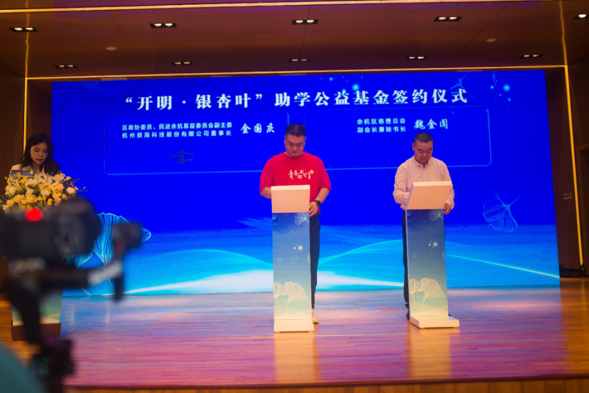 5月29日,由民进余杭区基层委员会主办、杭州叙简科技股份有限公司承办、余杭区慈善总会、余杭区绿产集团、杭州新奇广告公司支持,举办主题为“益”路同行,共富余杭,“开明•银杏叶”社会服务品牌发布暨助学公益基金签约仪式,民进浙江省委会副主委、民进杭州市委会主委、市钱投集团总经理楼秀华,民进浙江省委会社会服务部部长韩依群,民进杭州市委会副主委林沛、张钎、陈月利,余杭区政协副主席斯建刚出席活动,余杭区委统战部、区教育局、区慈善总会等相关领导参加。