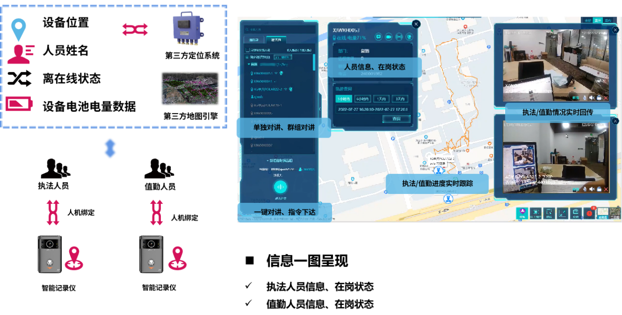 前端?員佩戴智能記錄儀,能夠在系統(tǒng)上實時顯??員姓名、設(shè)備位置、在離線狀態(tài)、設(shè)備電池電量數(shù)據(jù)??山Y(jié)合第三?定位系統(tǒng)或地圖引擎使?,實現(xiàn)前端?員信息?圖呈現(xiàn)。