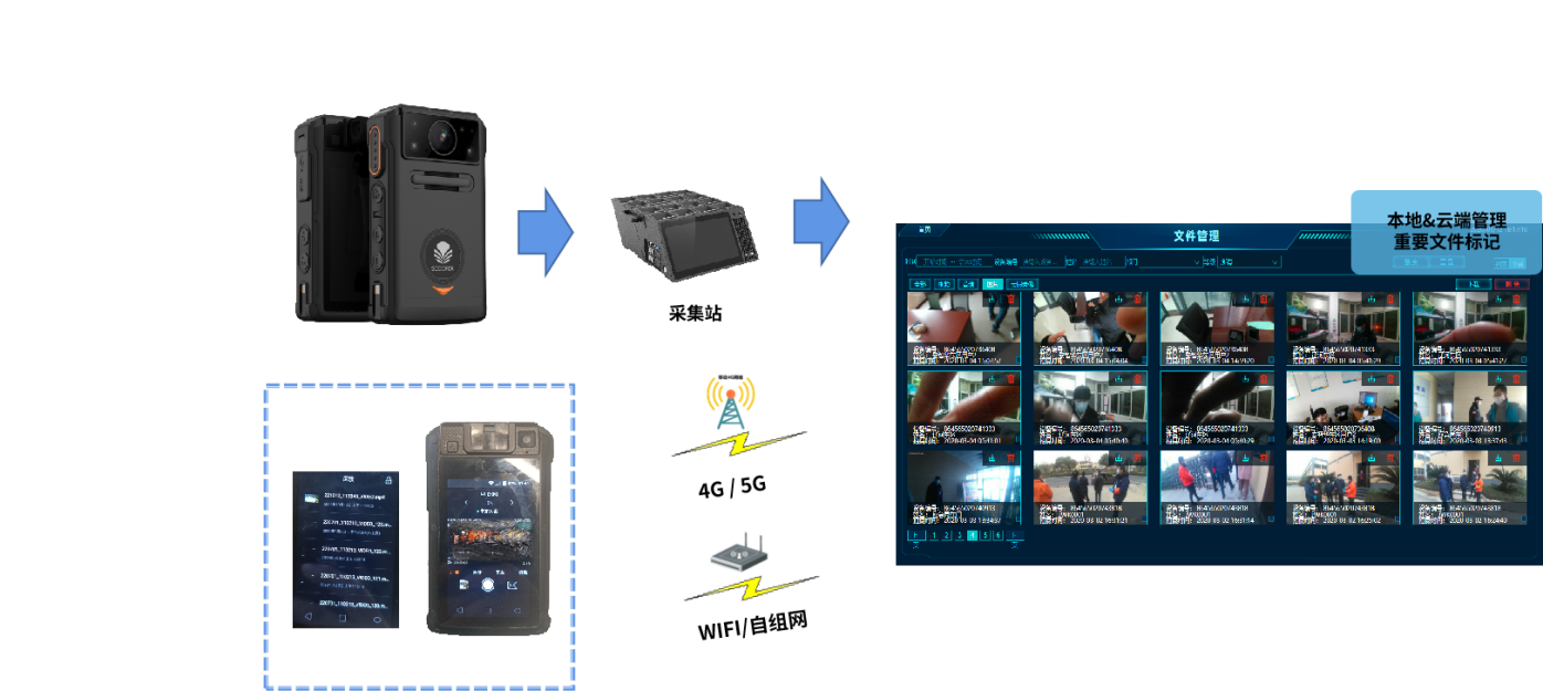 前端人員佩戴的智能記錄儀可將現(xiàn)場數(shù)據(jù)存儲在本地終端,也可通過4G/5G/WIFI/MESH等無線傳輸方式實時回傳至后端存儲。設(shè)備同時可搭配采集站使用(桌面式/壁掛式/立式),實現(xiàn)現(xiàn)場執(zhí)法記錄或作業(yè)記錄的自動采集和回傳存檔。
