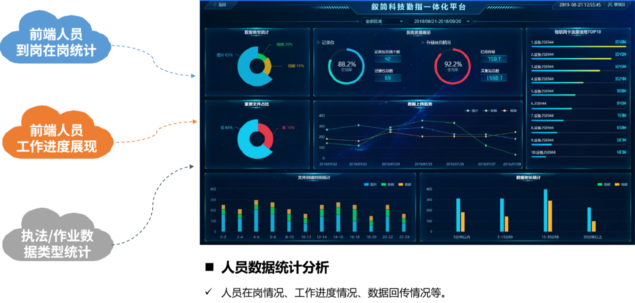 系統(tǒng)支持對人員、單位、執(zhí)法/作業(yè)類型按多維度(工作時間、數(shù)量、類型等)進行綜合考核分析,為績效監(jiān)督部門提供詳細(xì)的考評依據(jù)。