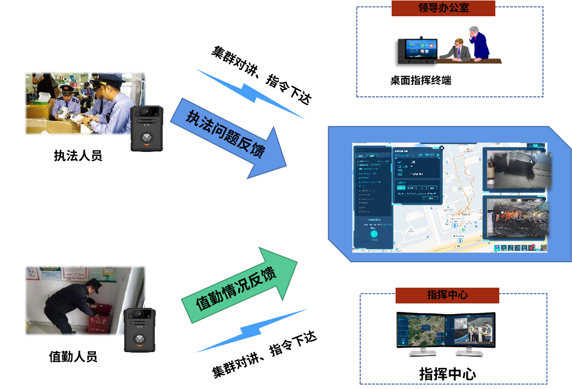 指揮中心能夠基于圖上調(diào)度,通過實時視頻的查看,實時了解現(xiàn)場人員的執(zhí)法或作業(yè)情況。能夠直接一鍵進行集群對講,完成指令下達。同時可追蹤前端人員軌跡,實現(xiàn)現(xiàn)場信息的實時可知,讓執(zhí)法/作業(yè)過程透明化、規(guī)范化。