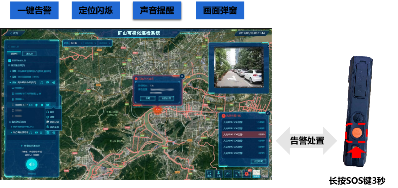 執(zhí)法過程或作業(yè)過程中存在異常情況時,前端人員可長按智能記錄儀的“SOS”按鈕,一鍵告警反饋,指揮中心可實時處理。系統(tǒng)上將進行定位閃爍、聲音提醒及畫面彈窗,提醒指揮人員進行遠(yuǎn)程查看及處置。